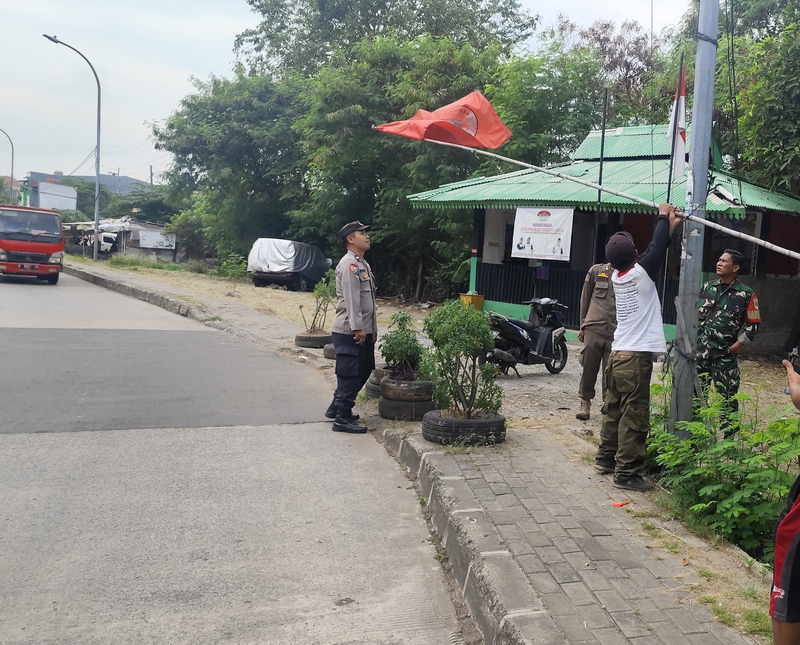 Kegiatan dimulai pukul 08.30 WIB dan berlangsung di Jalan akses RGTC, RT 15 RW 07, Kelurahan Cakung Barat. Dalam giat tersebut, Kapolsek Cakung AKP Komang Karisma, S.I.K diwakili oleh Bhabinkamtibmas Aipda Tri Pujianto. Ia didampingi Babinsa Serda Azhar dan personel Satpol PP Kecamatan. Penurunan dilakukan terhadap tiga bendera FORKKABI yang sebelumnya terpasang di lokasi tersebut.