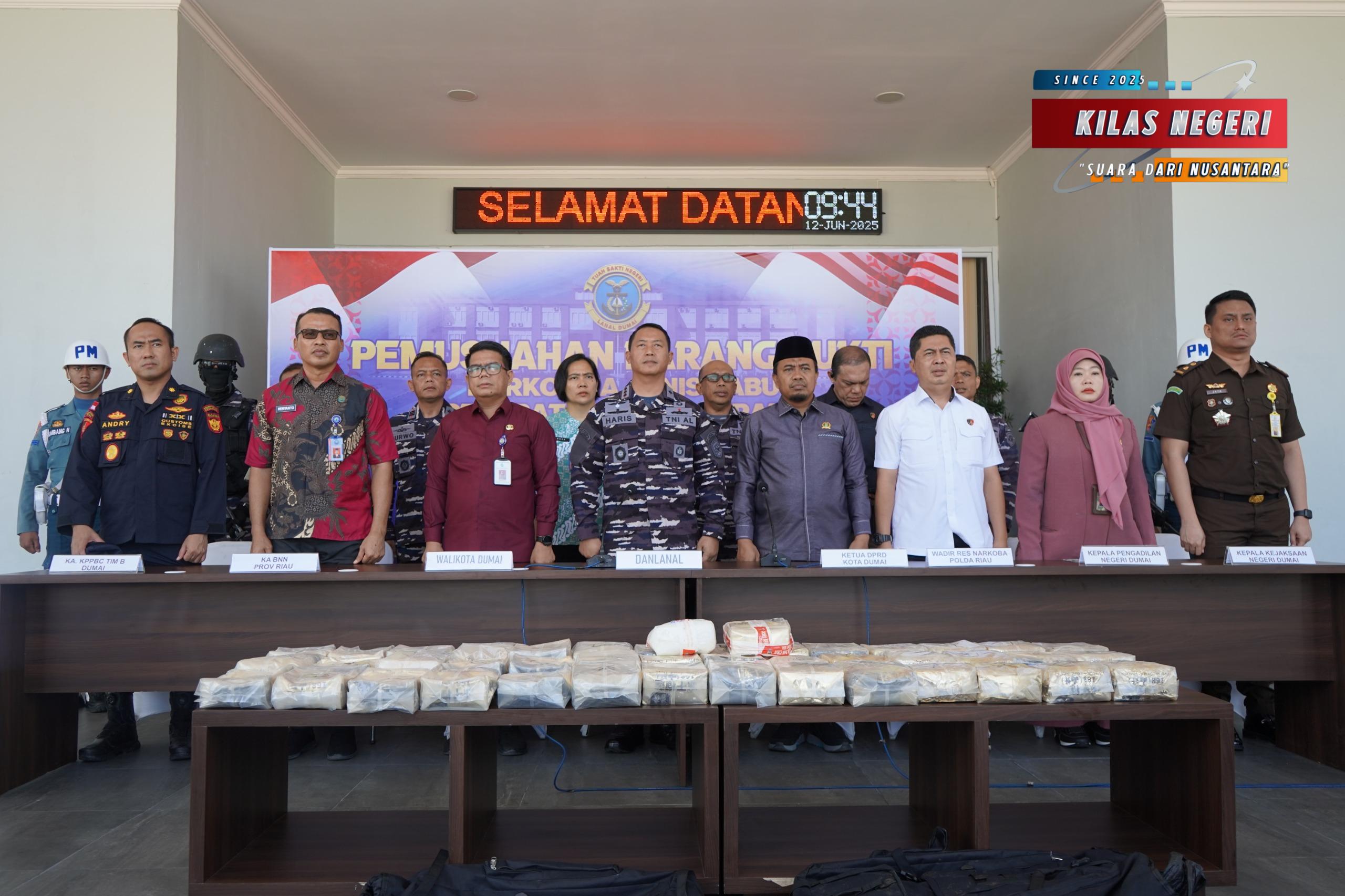 TNI AL, Dumai, Kilas Negeri – Dalam upaya nyata memberantas peredaran narkoba di Indonesia, Pangkalan TNI Angkatan Laut (Lanal) Dumai menggelar acara pemusnahan barang bukti narkotika jenis sabu seberat 48,54 Kg di Mako Lanal Dumai, Jalan Yos Soedarso No.01, Kota Dumai. Acara ini dipimpin langsung oleh Komandan Lanal Dumai Kolonel Laut (P) Abdul Haris S.E., M.M.D.S., yang didampingi oleh (PJU) Lanal Dumai, Kamis (12/6/2025).
