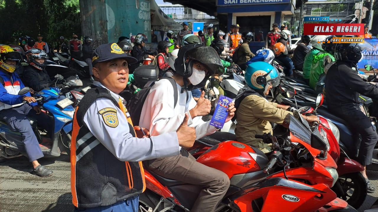 Petugas memberikan imbauan langsung kepada pengendara roda dua dan roda empat terkait etika berlalu lintas, kepatuhan terhadap rambu, serta pentingnya kelengkapan kendaraan demi keselamatan bersama.