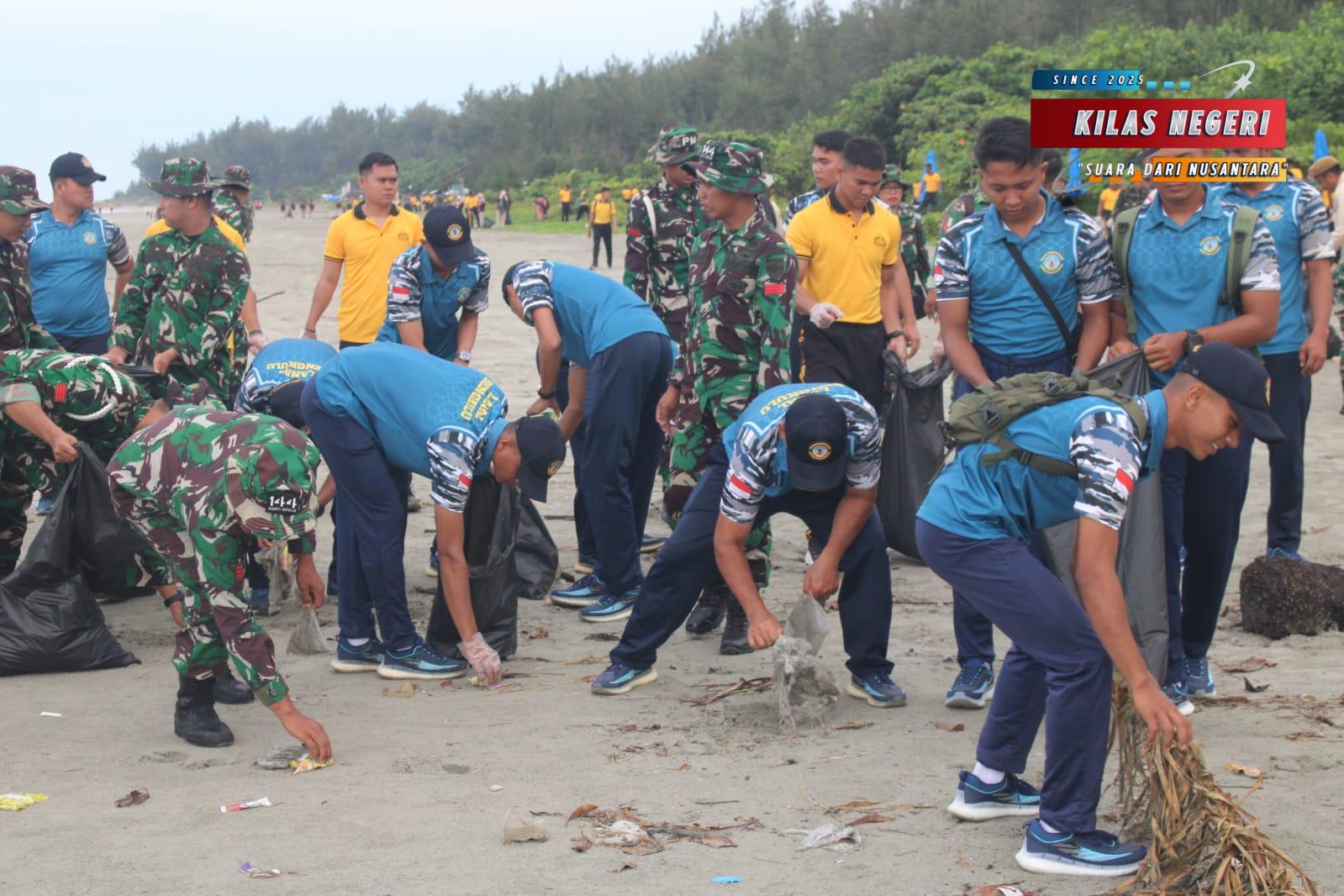 Para personel gabungan melaksanakan pembersihan sampah disepanjang kawasan pantai sebagai bentuk kepedulian terhadap lingkungan hidup serta upaya nyata mendukung terwujudnya wilayah pesisir yang bersih, sehat, dan berkelanjutan.